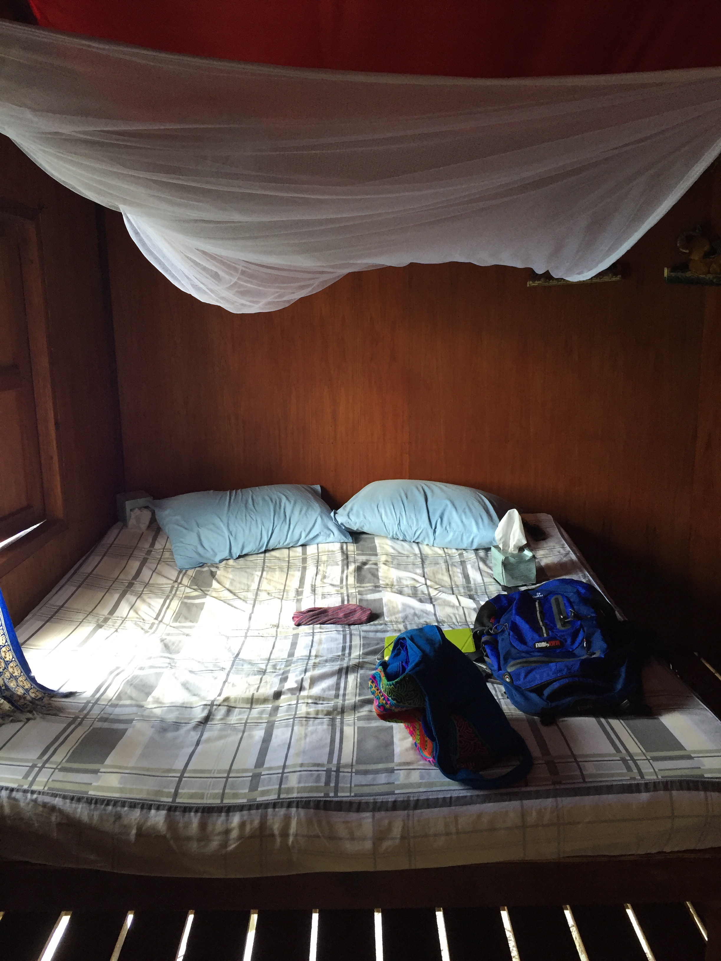 The mosquito nets had holes, the window had no glass or flyscreen and the taxi boats zoomed past all day and night with their incredibly loud motors. But none of these things mattered hugely or were terribly unexpected. The one thing I had trouble coping with was the hardness of the bed. It genuinely felt like a board with a blanket or two thrown over it. I sleep on my side normally but couldn’t because it was so hard – but my back was sunburned pretty badly so lying on my back was painful. It wasn’t a great start!