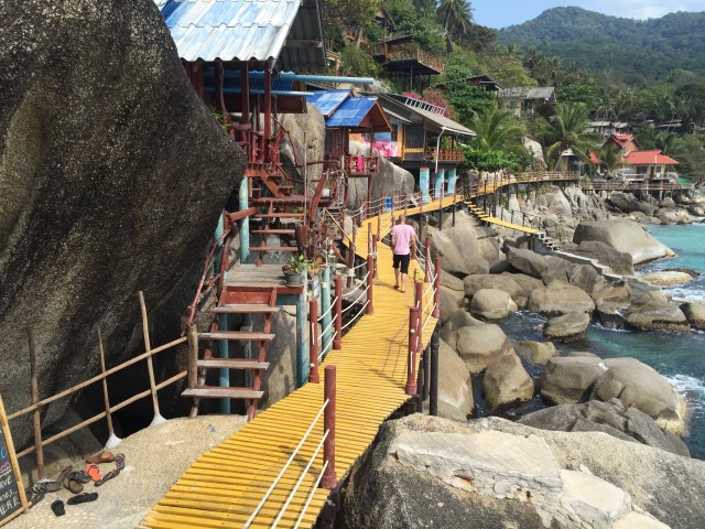 The ferry ride was about an hour, then we walked through Haad Rin to the other side of the headland where we caught a taxi boat to our destination, a couple of beaches up. The place we were heading is a little legendary amongst our friends. Luke and I had not been there before but Nicolette had, and our friend Ben was already there. For years people we knew had been going there to chill out and party. It’s a relatively quiet beach with cheap accommodation and only one proper resort. Few of the cheap places can be booked ahead – you just have to turn up and hope there’s room. Due to a miscommunication about whether or not others had booked, Charmaine had found one place that would take reservations and booked rooms for us, Lauren, Kupp, Toby and herself. The others wanted to wait until we got there. The place we had booked was set along the headland beyond the beach, with a string of bungalows perched along a boardwalk on rocks.