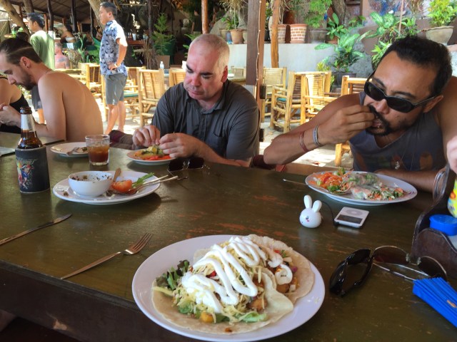 We did a couple of things while we were there. On our last day, for a special birthday lunch, we went to a place called ‘The Sanctuary’ at a nearby beach. It was a yoga retreat that excelled in pretentiousness but had a good restaurant with two menus, one with healthy but normal food, and one with a special diet for people who’d been fasting and having enemas. It was entertaining to watch the crowd – so many rich hippies! – and laugh at the menu items. My fish tacos were delicious!
