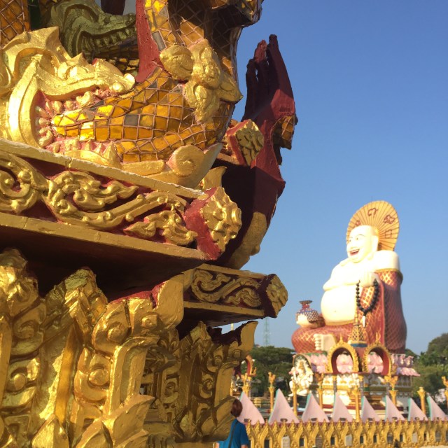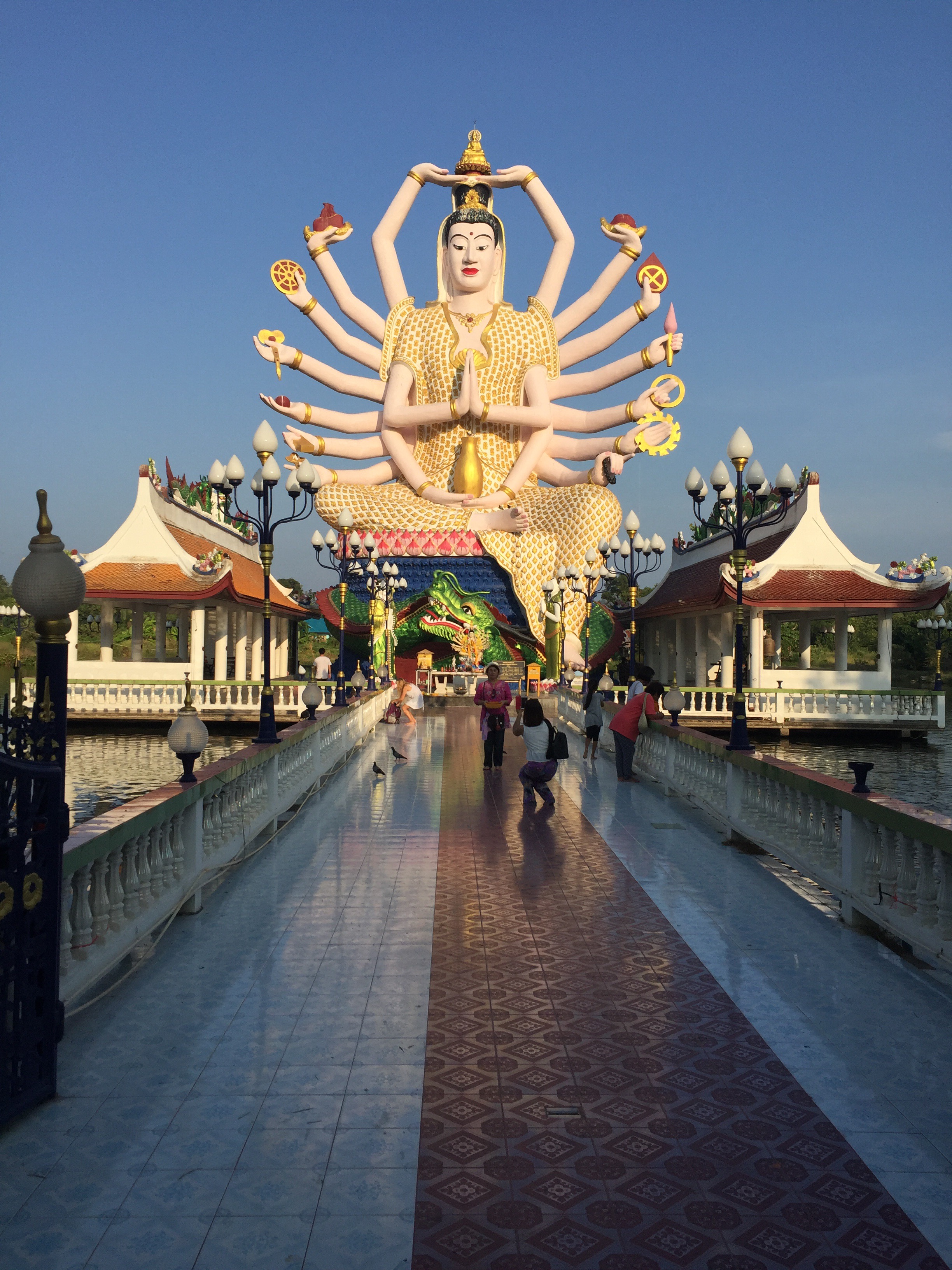 I can’t remember the name of the complex, but there were a number of gilt temples that were fairly new. There were a lot of chickens and dogs around and fish food could be bought for ten baht. I was looking forward to feeding the fish, but when we walked over to the pool it was murky and didn’t smell great. When we threw the food in these huge, ugly catfish swarmed to the surface – it was nightmarish! There were also turtles competing (poorly) for food so we tried to throw it towards them but the hideous fish were everywhere.