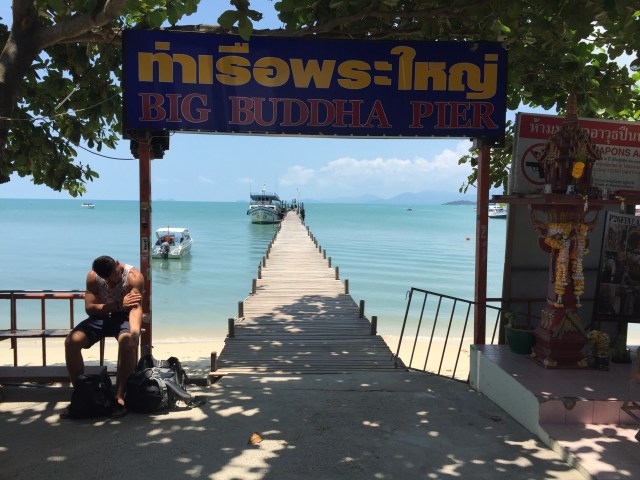 In the morning Nicolette took the lead for the next part of the journey and we packed up our gear and headed to Big Buddha Pier for the ferry. I only just noticed the guy in this photo checking out his own muscles. Stay classy, Samui!