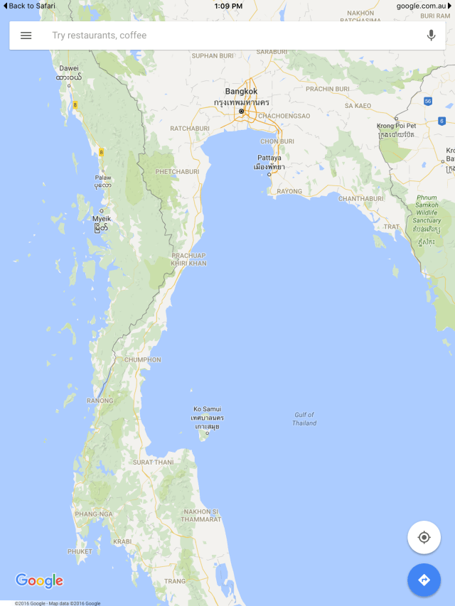 The next destination after Bangkok was Koh Phanang, which is a small island south of Bangkok, and north of the larger island of Koh Samui (‘koh’ means island). Here’s a map for those who are interested (I always like to be able to visualise where places are):