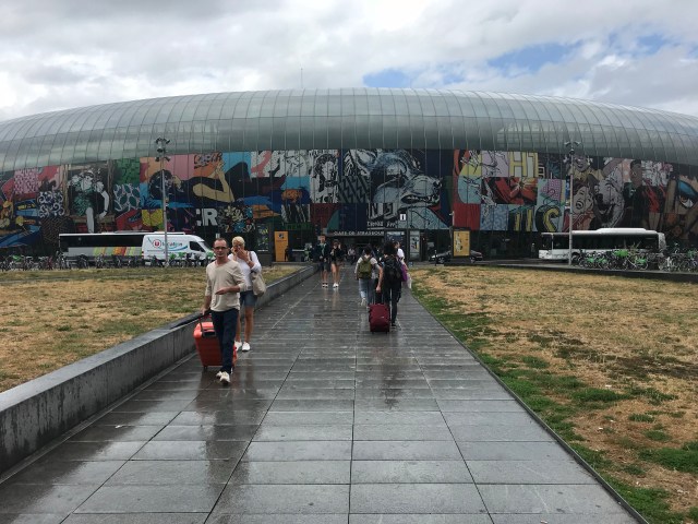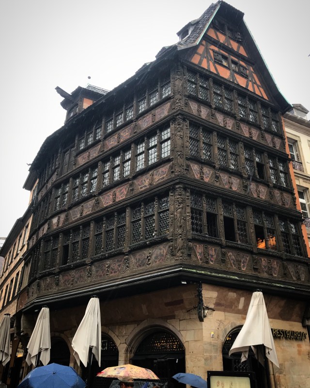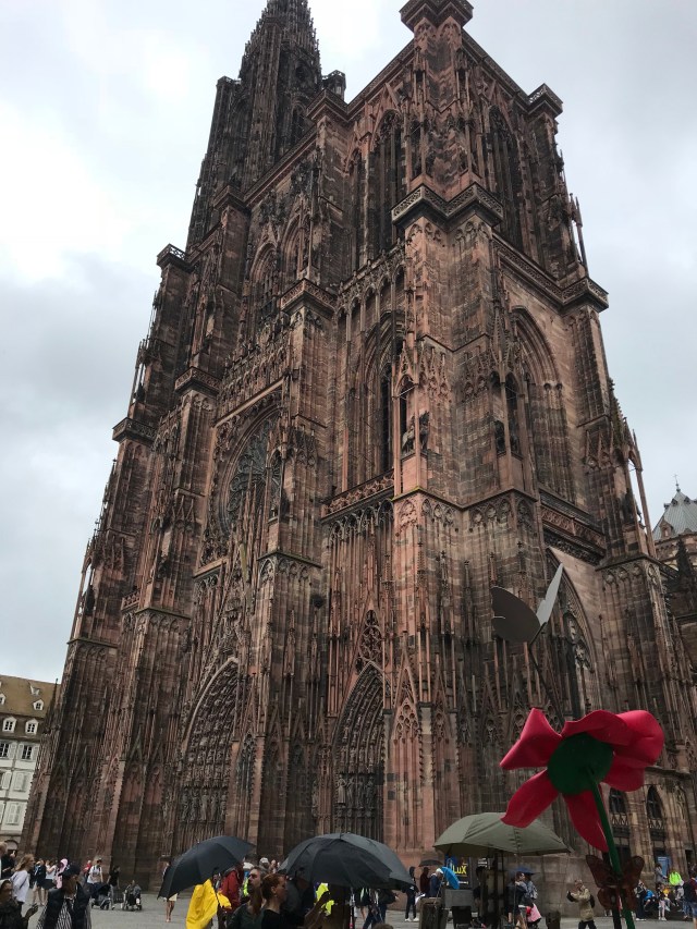 The old centre of Strasbourg is an island in a river and it is very pretty. We probably didn’t see it quite at its best as it was a rainy day but we enjoyed it anyhow. There is a huuuuuuge cathedral in the middle of the city. It is made of a pink stone that has blackened with age. The line to go in was about half a kilometre long so we didn’t bother but admired it from outside. Excuse my rubbish photo but I couldn’t get far enough back from it to get the whole thing in.