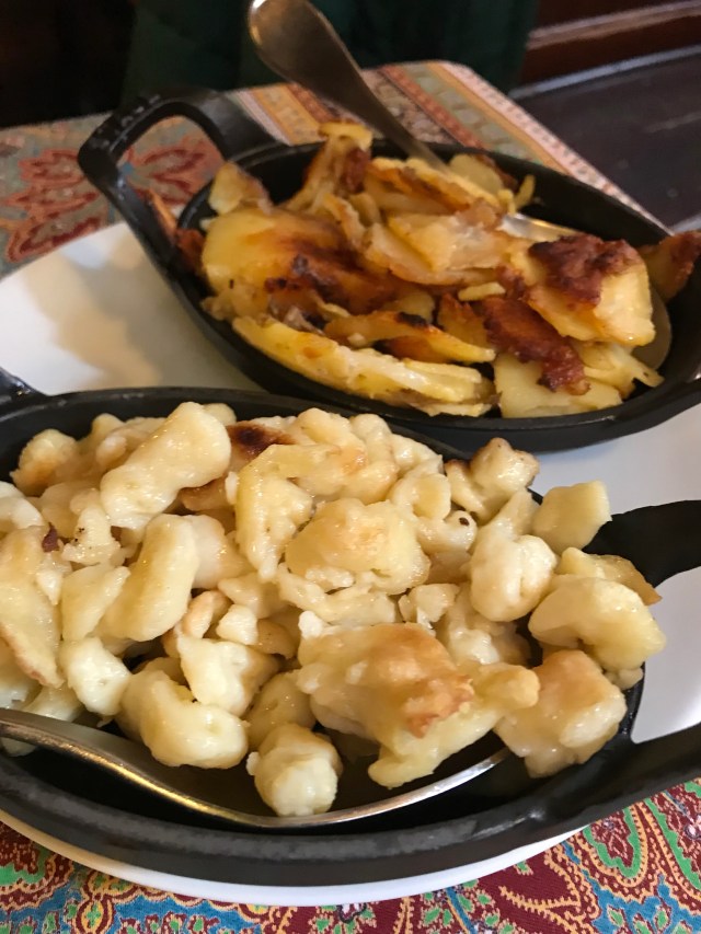 I had coq au vin but with a white riesling sauce. Delicious! And spaetzel, the local pasta that looks knobby, like twisties.