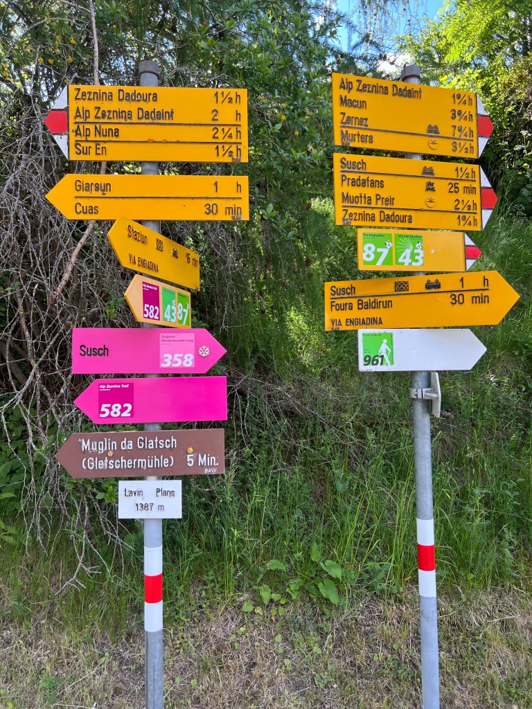 While it is a lot for a week’s travel, this is a very expensive part of the world and the views are tremendous. The entire route has views of snow-capped jagged mountains and fields of flowers. The most scenic part was day 4, between Ardez and Ftan. A cheaper and easier way to enjoy the sights would be to use the local bus system to get about and walk between some of the most picturesque places.