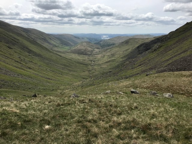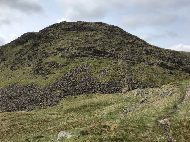 I managed fine up to the descent down towards the pass at the top of Troutbeck. The path pretty much disappeared and I had to put my sticks away to use my hands to help lower myself down the rocks for a short way. The hillside in the photo below is the one I scrambled down.