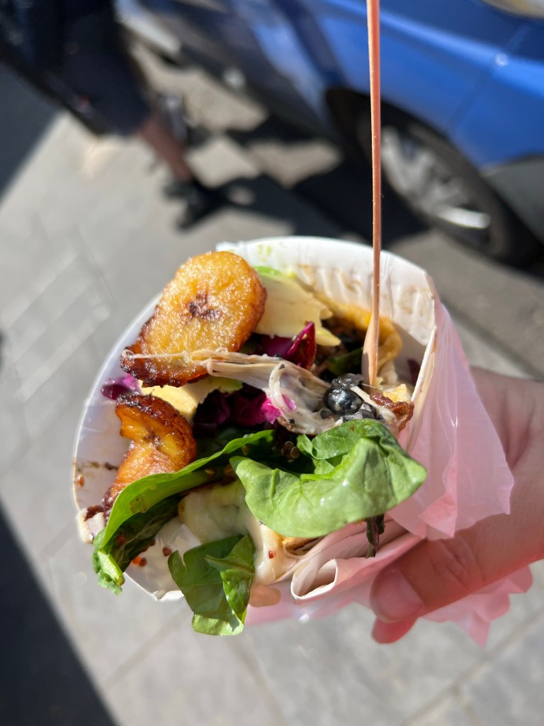 I went for a Peruvian arepa, which always reminds me of Charmaine as she taught me how to make them – although so long ago I’ve forgotten. This had plantain in it, which I haven’t had for ages.