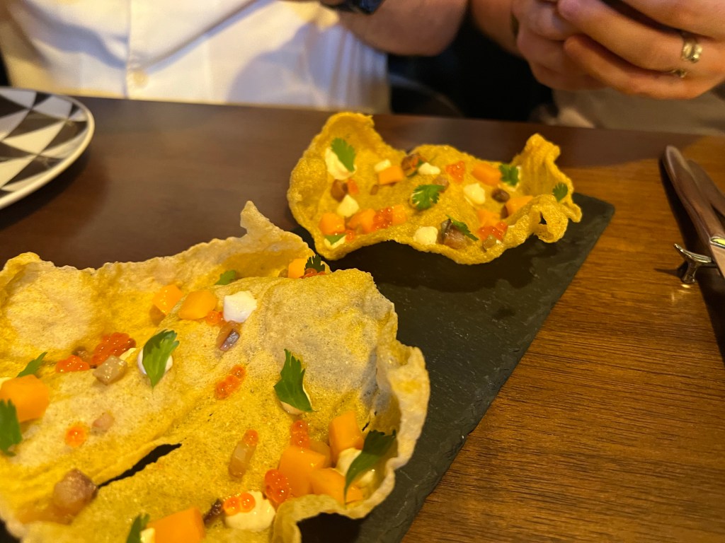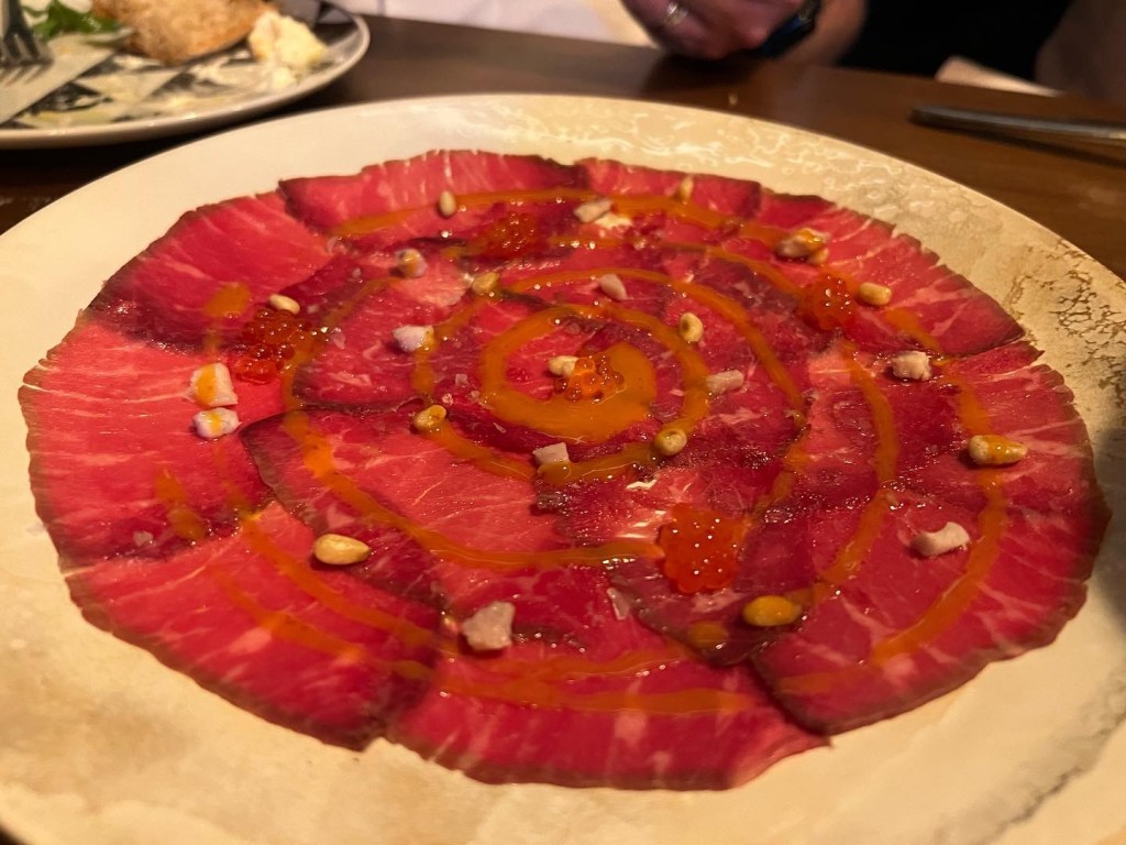 Calf bikini with trumpets of death (a type of mushroom). Delicious and not as dramatic as the name suggests.Curry crispy rice with mango, sardines and roe.Carpaccio with pine nuts.Burrata salad