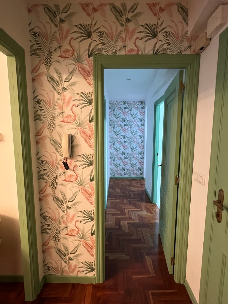 The interior is mostly mint green trim and feature walls of flamingo wallpaper.