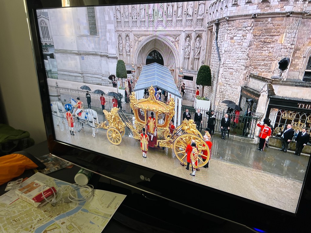 We walked around the old town.We went to the art gallery.We saw lots of lovely impressionist work.We walked along the river and took some photos for some tourists. We found a market.And a free rock music festival We watched a bit of the coronation on tv. We saw pigeons causing havoc on unattended tables, inadvertently smashing wine glasses and bottles.