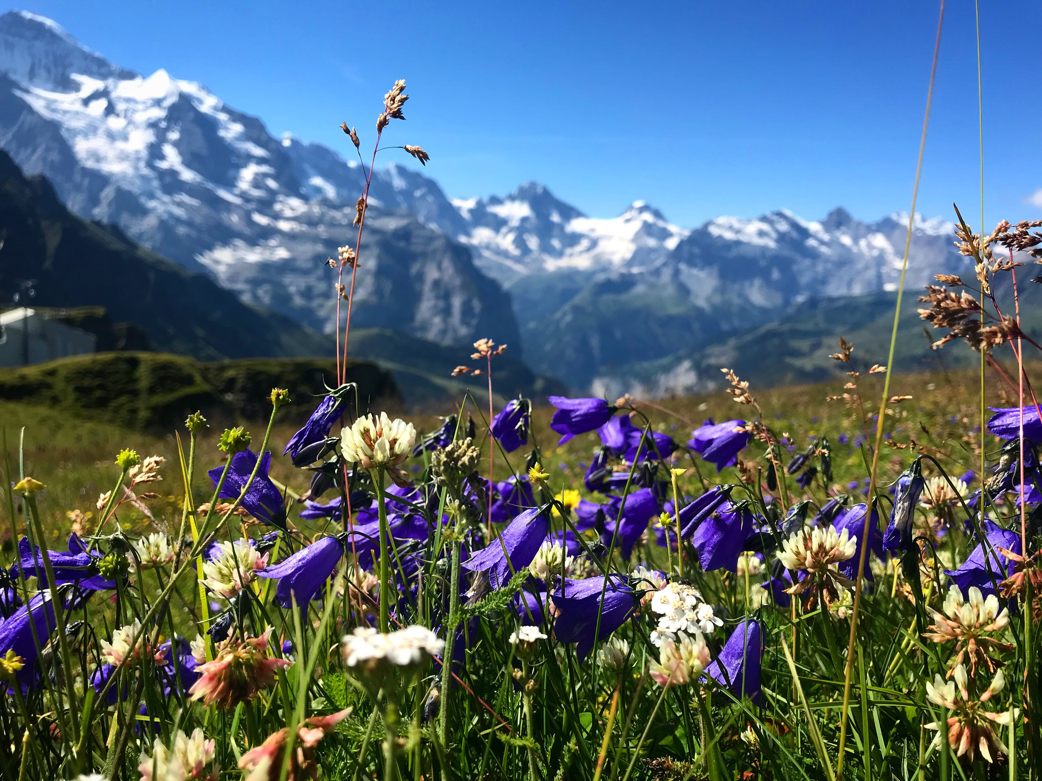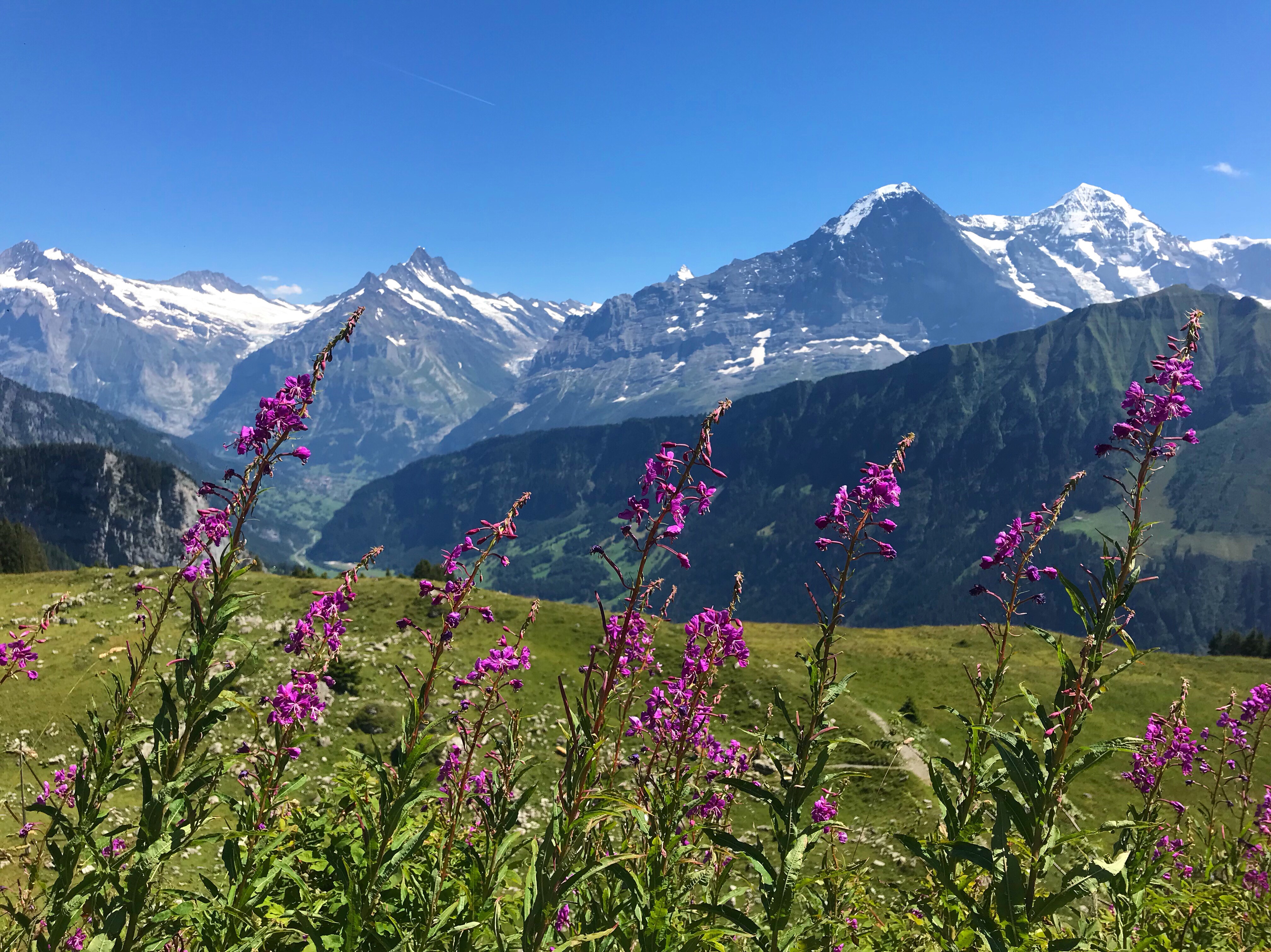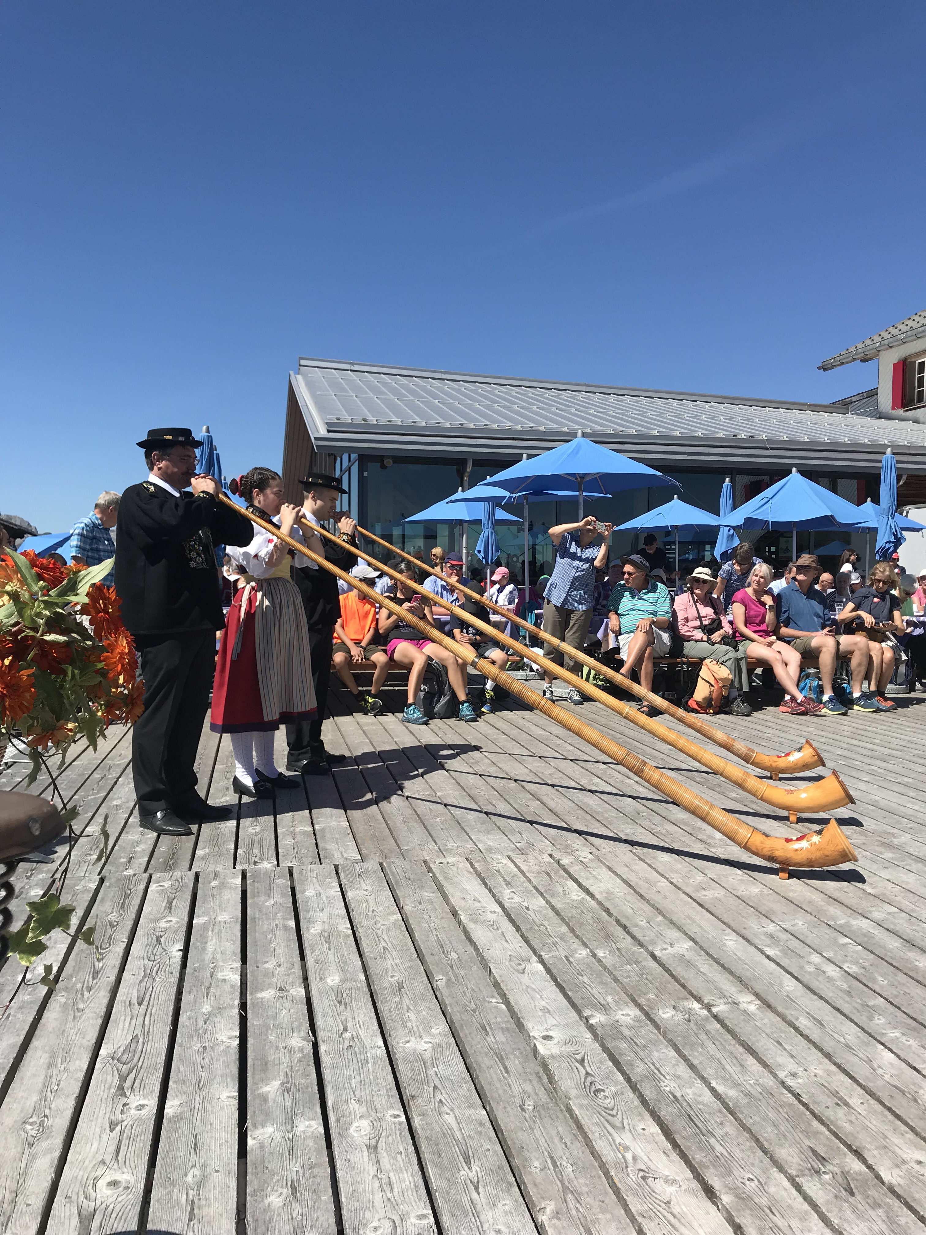Wildflowers everywhere, snow-capped mountains all around and Grindelwald visible down the valley in the distance. We took some photos and had a wander then made our way to the hotel, where all kind of Swiss things were happening on the deck.